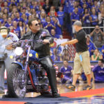 Kansas head coach Bill Self rides out onto James Naismith court on a custom-made motorcycle with imagery from the 2008 National Championship during Late Night in the Phog on Friday, Oct. 14, 2011 at Allen Fieldhouse.