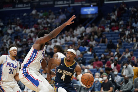 New Orleans Pelicans guard Devonte' Graham (4) passes around Philadelphia 76ers center Joel Embiid in the second half of an NBA basketball game in New Orleans, Wednesday, Oct. 20, 2021. The 76ers won 117-97. (AP Photo/Gerald Herbert)
