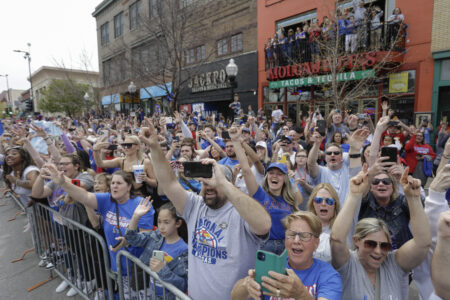 Jayhawk fans line Massachusetts Street to watch a parade and celebrate the KU men’s basketball team’s NCAA basketball championship Sunday, April 10, 2022.