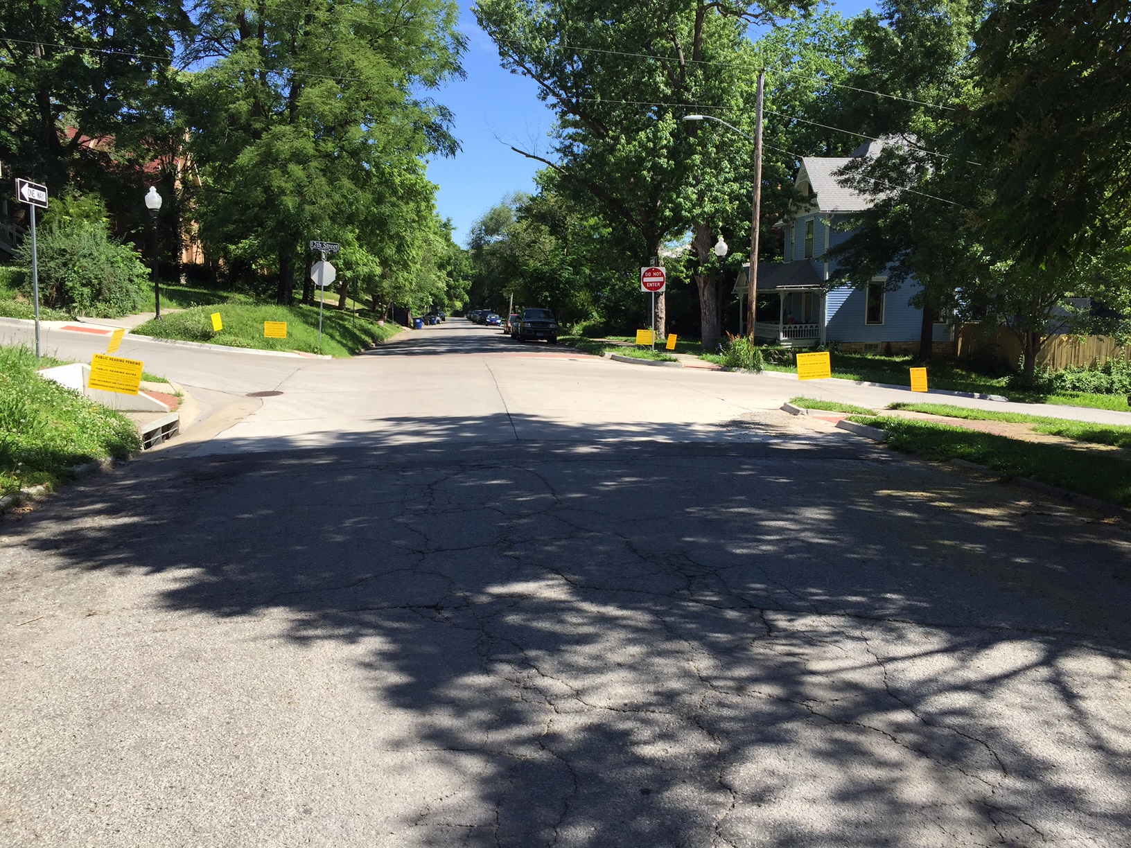 There are yellow signs everywhere in the Oread neighborhood currently, but, no, plans have not been filed to build a giant cookie factory in the historic neighborhood. Instead, new design guidelines have been proposed for the neighborhood. Actually, the design guidelines already have been approved once, but city officials realized after the fact that they had not met the letter of the law when it came to notifying residents of the proposed changes. City code requires the yellow signs to be posted on property that will be affected by zoning or development code changes. That wasn’t done the first time the design guidelines were heard. If the city placed a yellow sign at every property in the Oread neighborhood, that would be several thousand signs. My understanding is city officials have determined that placing a sign at every intersection in the neighborhood will meet the requirement. More specifically, every corner of every intersection has been the thought process. That means that there are eight signs at every intersection.