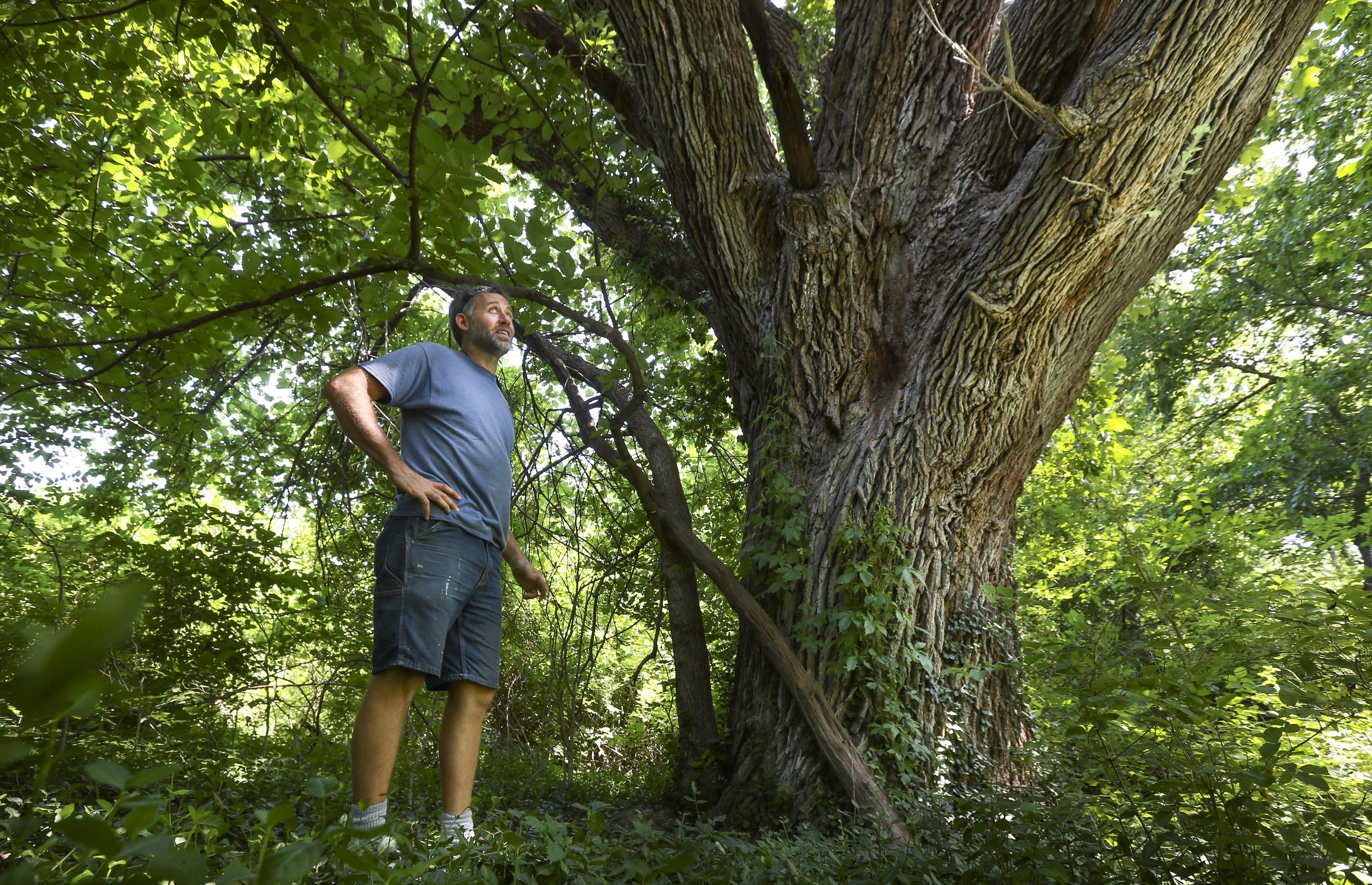 Matt Jones, a founding partner of Struct/Restruct, looks out from the base of a bur oak tree near the eastern edge of a plot of land in East Lawrence at 12th Street and Haskell Avenue. Struct/Restruct, which owns the land, planned to sell the lot that contains the tree to the city of Lawrence for 8,000. The tree is believed to be one of the largest in the state.