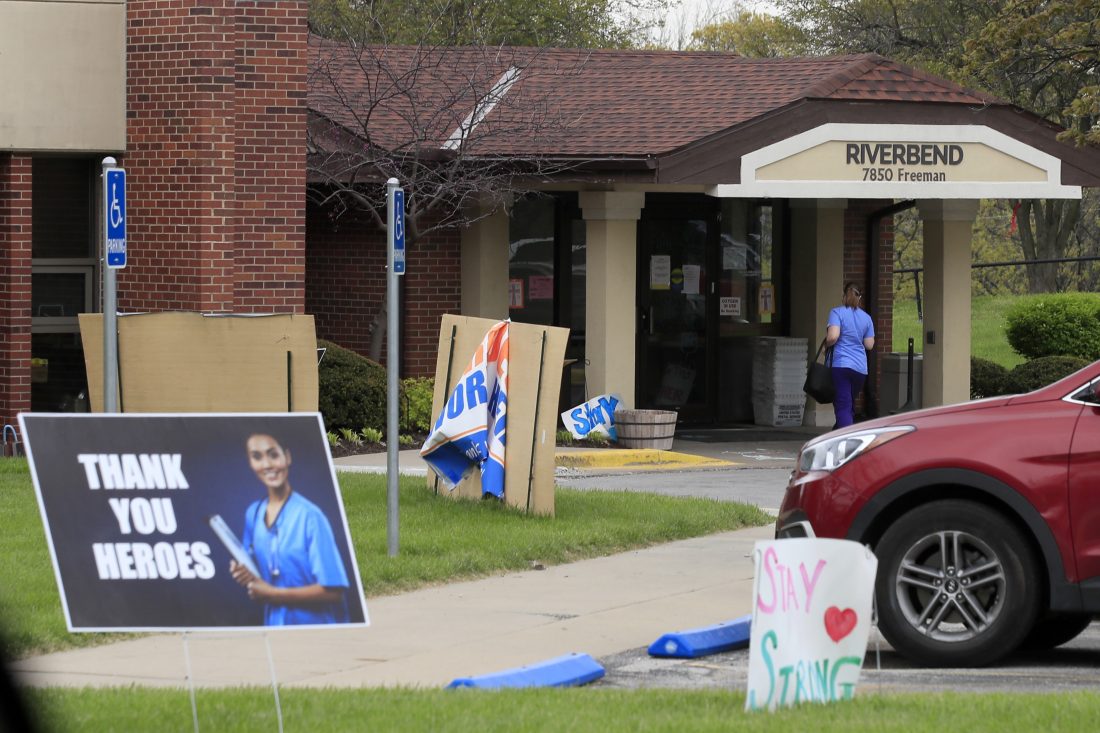 A worker enters Riverbend Post Acute Rehabilitation in Kansas City, Kan., Wednesday, April 22, 2020. (AP Photo/Orlin Wagner)