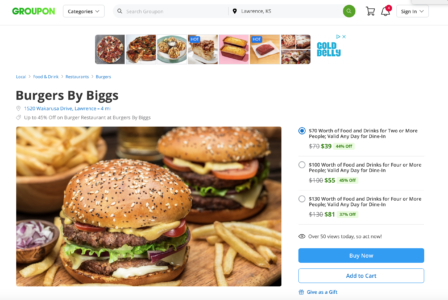 Editor’s Note: The Groupon deal for Burgers by Biggs has shown up in several digital advertisements, including one that has appeared on LJWorld.com. That ad was placed automatically — or programmatically as it is known in the advertising industry — by a third party. The Journal-World’s IT team is now working to block that ad from showing up on LJWorld.com.