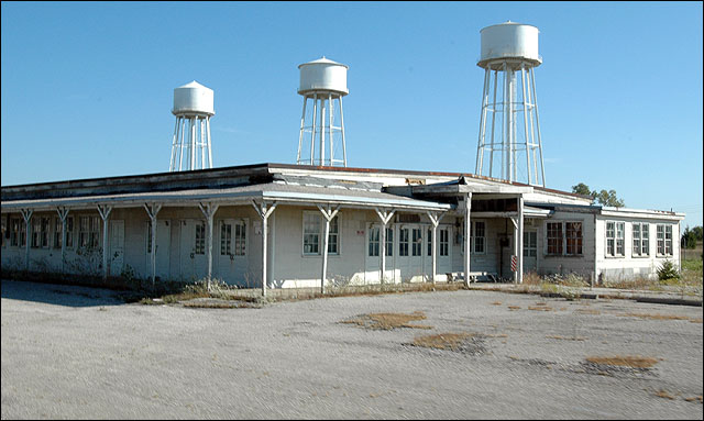 Water towers, which are familiar sites south of Kansas Highway 10 at De Soto, rise above a former administration building at the Sunflower Army Ammunition Plant in this 2005 file photo.