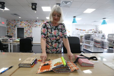 Cindy Herington, co-owner of Lawrence Craft Company, shows a variety of art journal and memory books that have been made at the store.