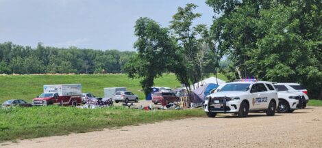 Police and emergency crews respond to a suspected overdose around 2:15 p.m. on July 17, 2023, at the city-supported campsite at 100 Maple St. in North Lawrence .