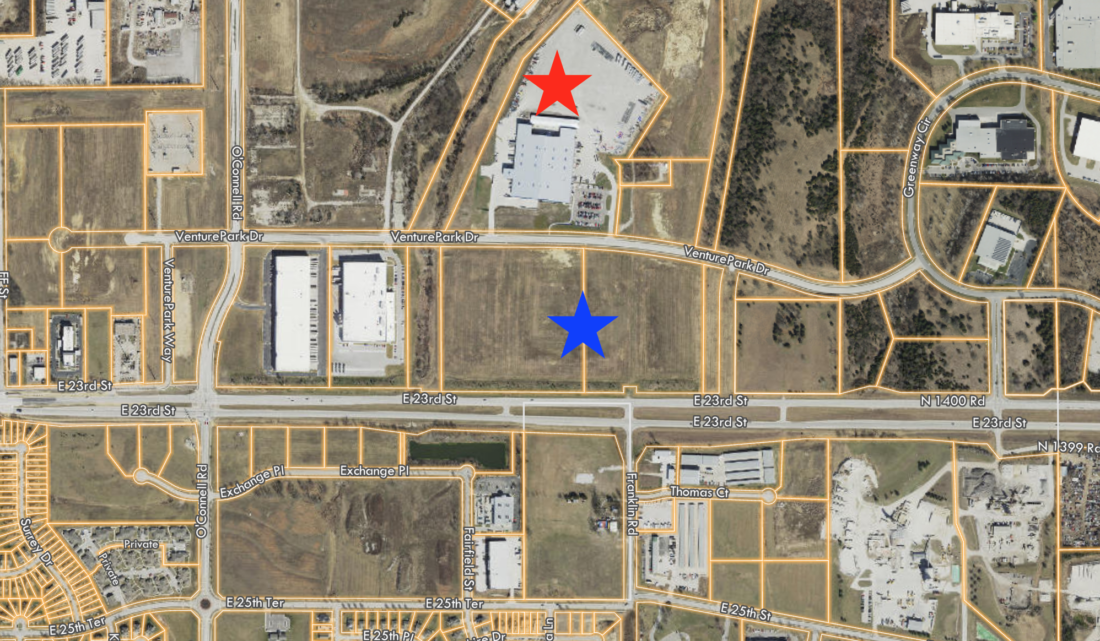 The blue star shows the proposed location for a new US Engineering production center in Lawrence VenturePark. The red star shows the company’s existing location.