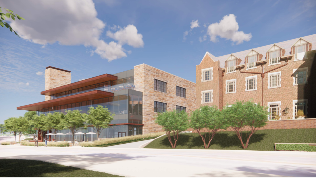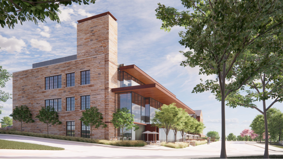A rendering shows a view of the north side of KU’s proposed entrepreneur hub near the end of Naismith Drive on University of Kansas main campus.