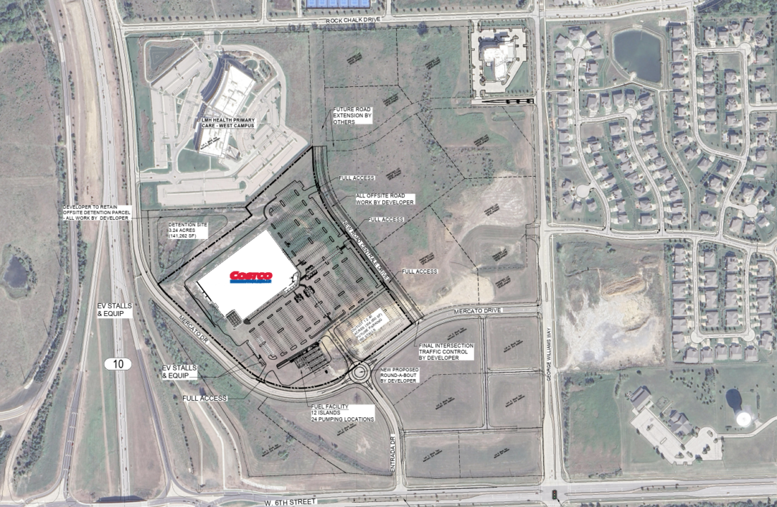 A site plan document shows the proposed location of a Costco store in northwest Lawrence.