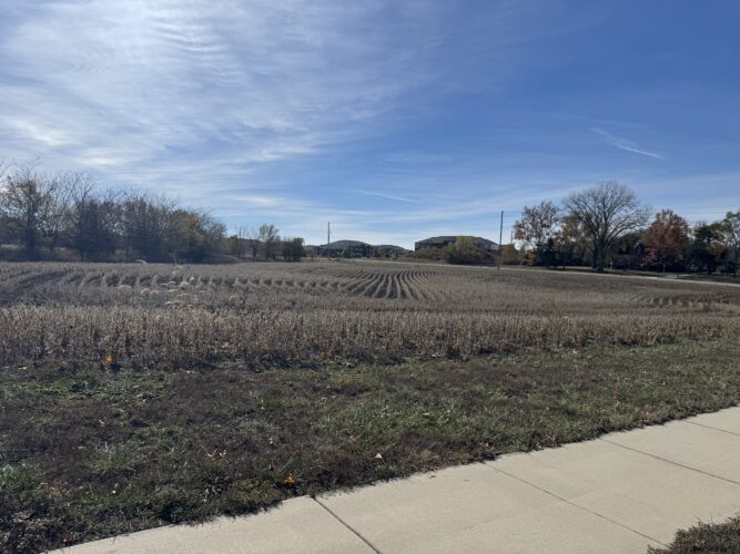 If you are having a hard time picturing the location, it is a farm field at the northeast corner of the intersection’s roundabout. (I’ve probably made both geometry and English teachers groan by saying a roundabout has a corner.) The site is essentially across the street from The Links apartment development, which is a large apartment complex built around a small golf course.