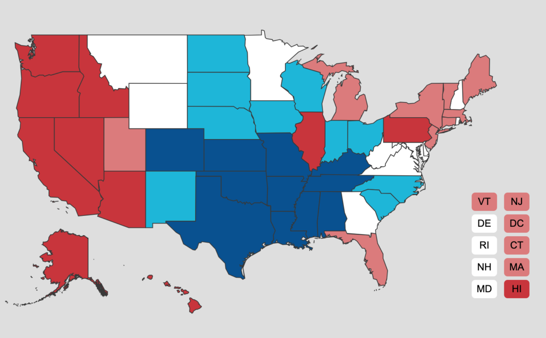 Here’s a map of the entire state. The same color coding system for pricing applies: Red is most expensive, white is middle of the road, and dark blue is the cheapest.