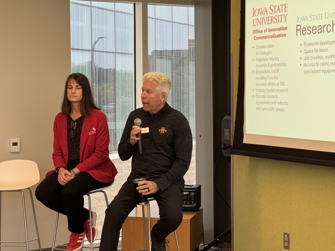 Alison Doyle, associate director of the ISU Research Park, and Rick Sanders, president of the park, talk to a Lawrence delegation on Oct. 14, 2025.