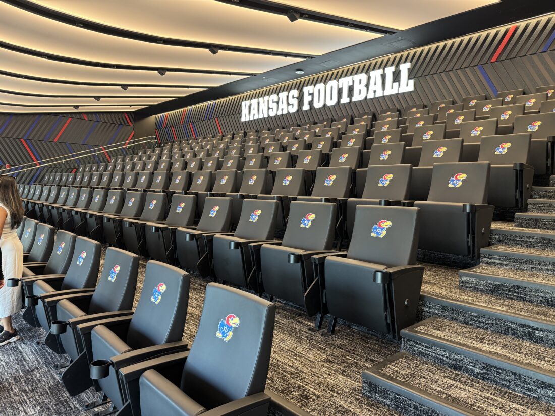 Theater-style seating in the film room of the Kansas football team is pictured on Oct. 16, 2025.