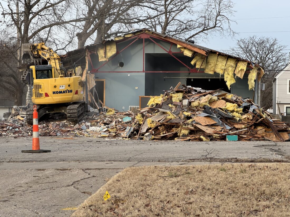 Demolition work is underway on Feb. 12, 2026 at the former retail location at 11th and Pennsylvania streets in East Lawrence.