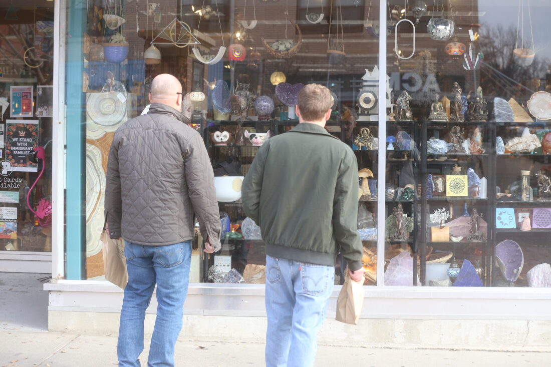 A pair of shoppers look at a storefront display in downtown Lawrence on Jan. 2, 2026.